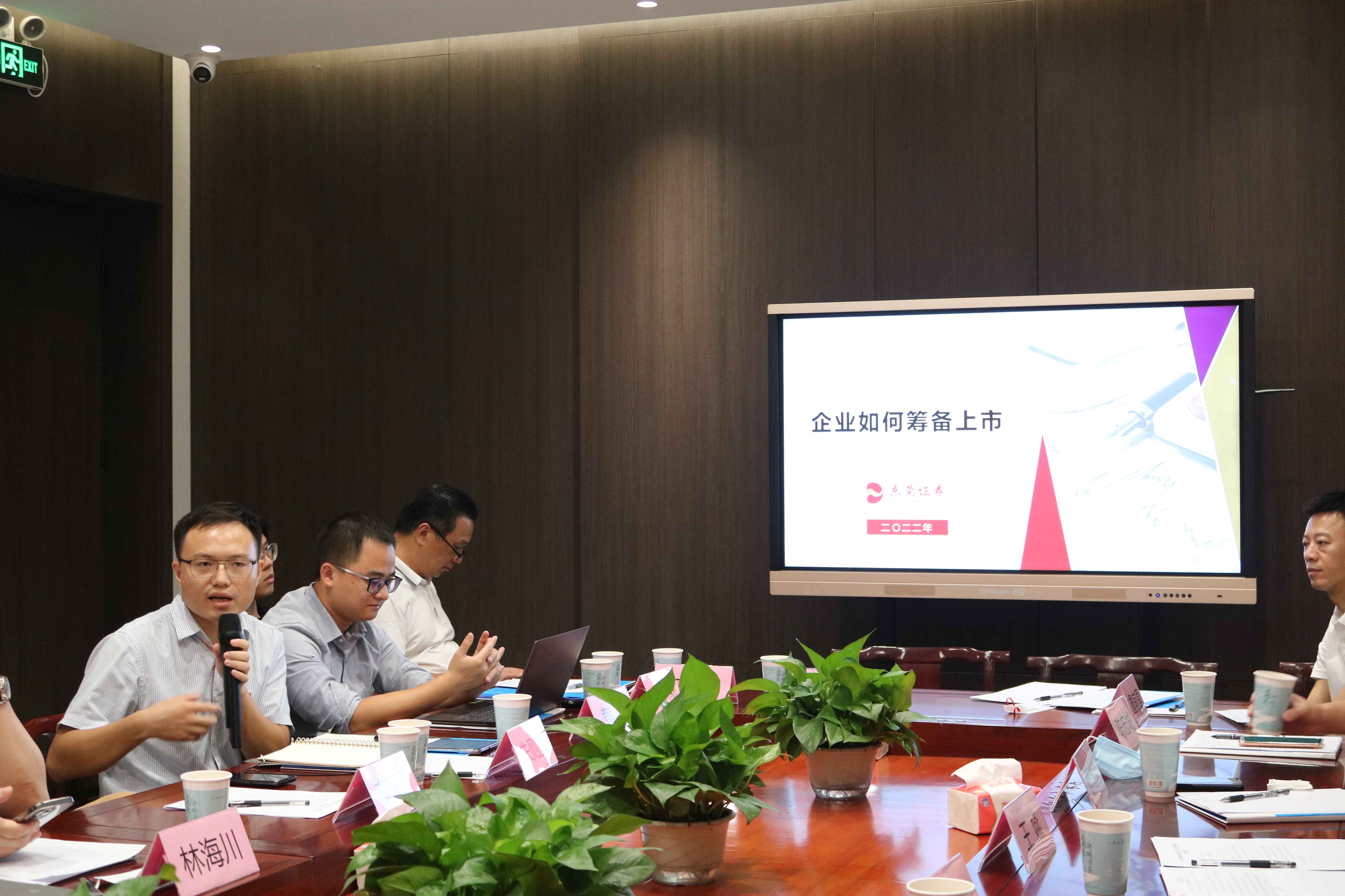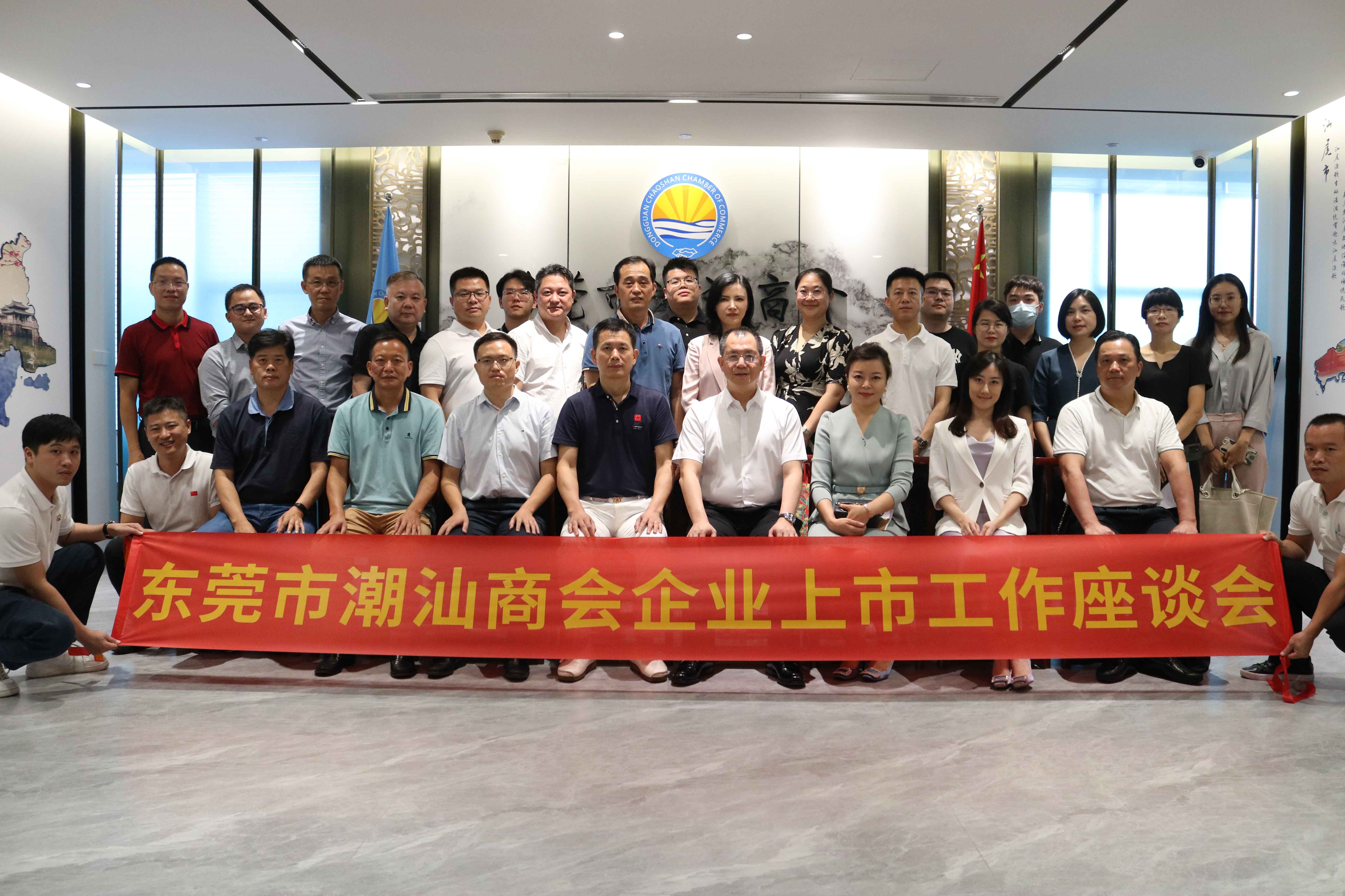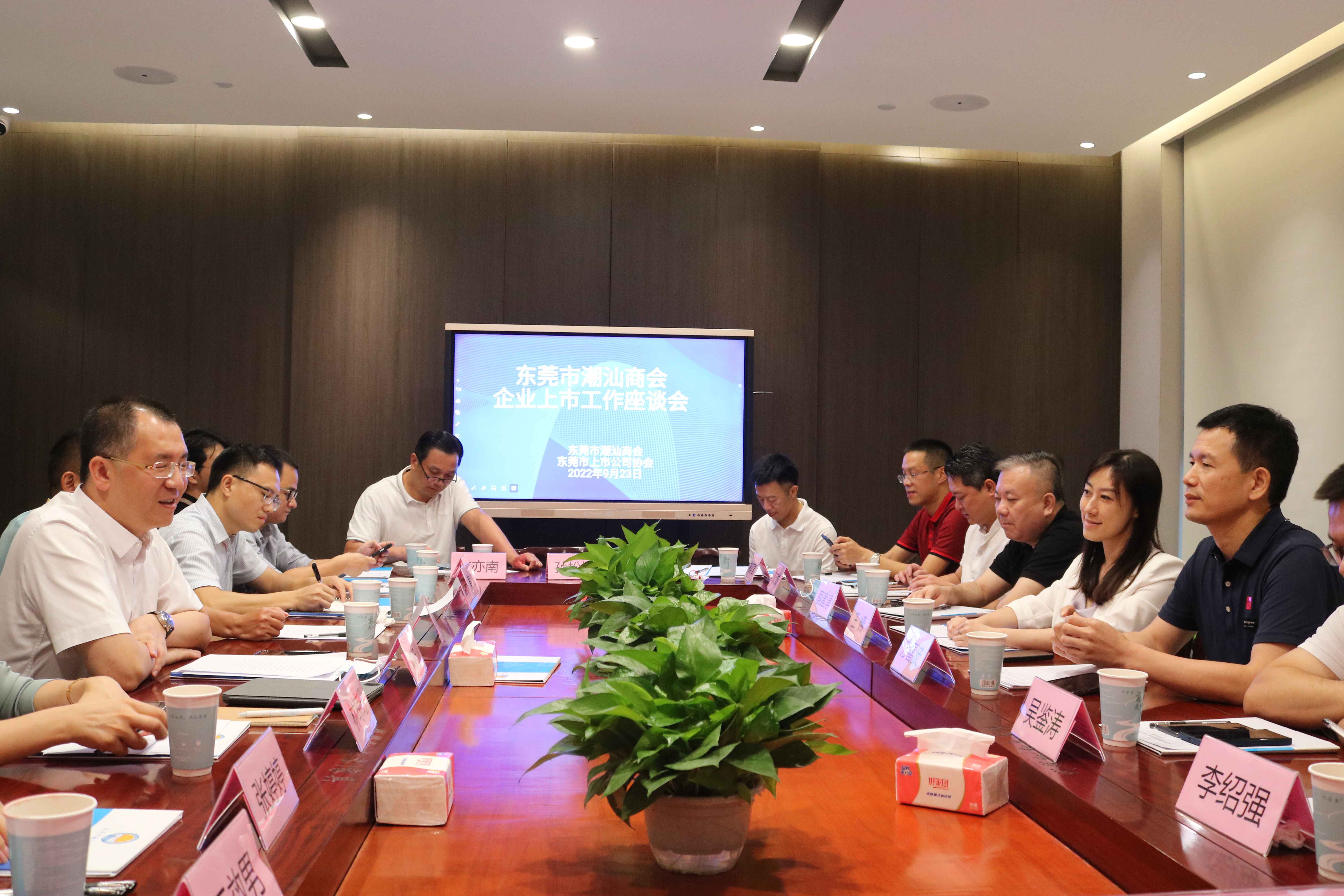 为加强与其他商协会组织的交流,加大企业上市推广工作力度,帮助更多东莞企业利用资本市场做大做强,9月23日,由东莞市潮汕商会和我会联合主办的企业上市工作座谈会在潮汕商会成功举办。协会林海川会长、李军印秘书长、捷邦科技董事、副总经理林琼珊、东莞证券投行五部总经理朱则亮等,以及潮汕商会近20家企业董事长和高管出席座谈会。