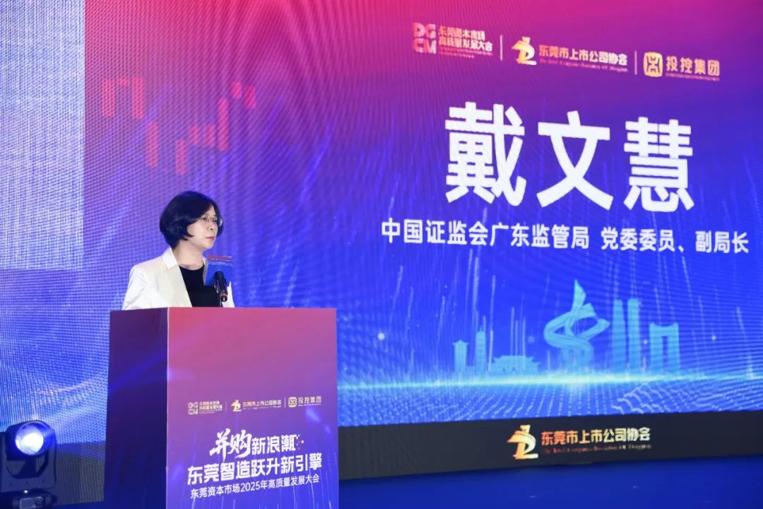 中国证监会广东监管局党委委员、副局长戴文慧致辞。她表示,当前广东正在聚精会神推进高质量发展,东莞上市公司保持稳健发展势头,希望上市公司控股股东、实际控制人增强责任意识,善用上市公司平台资源,利用资本市场工具开展并购重组,同时鼓励有条件的上市公司建立常态化稳定现金分红机制,加大回购增持力度,并要求上市公司增强合规意识,规范运作,保护投资者权益。