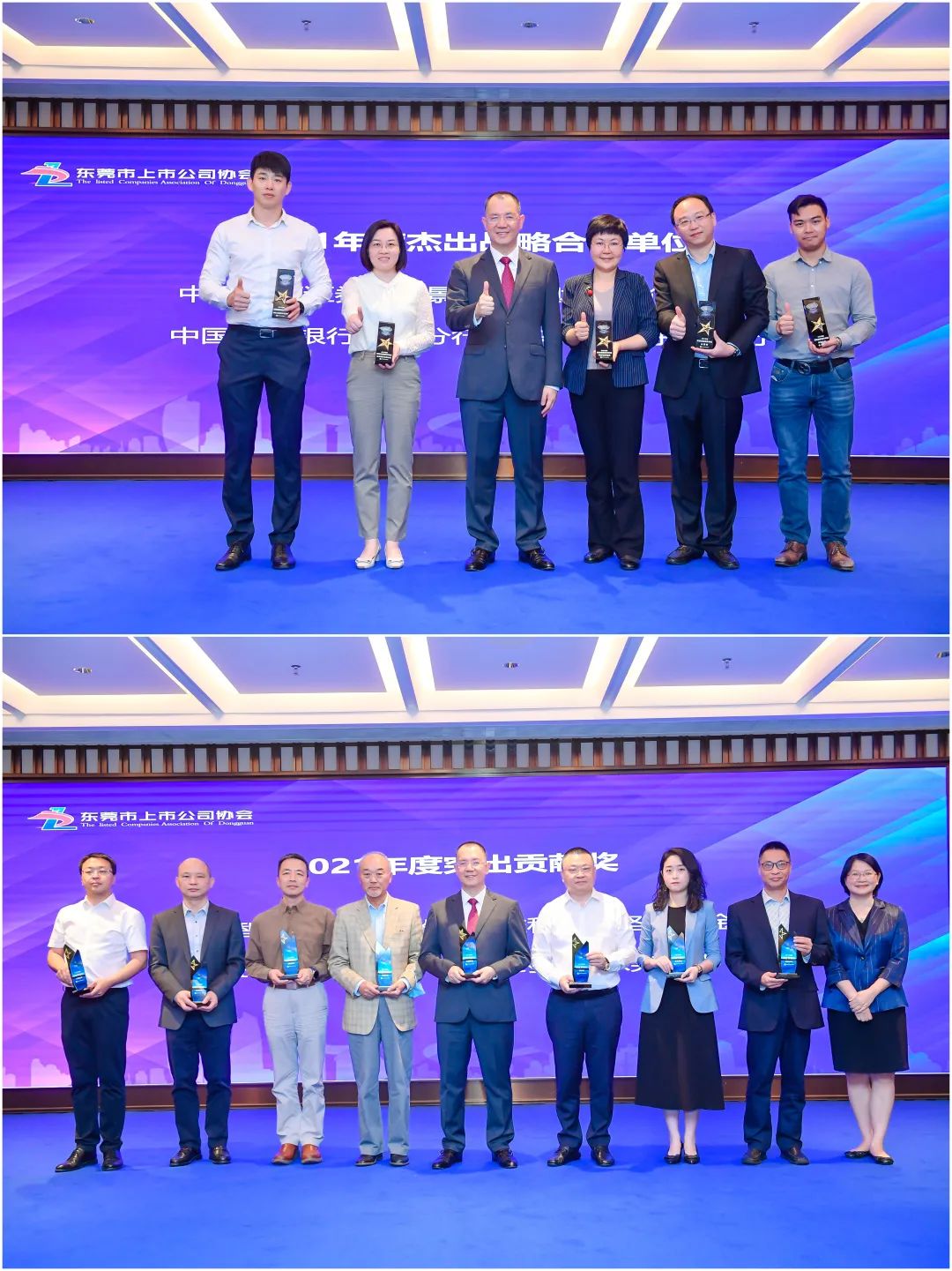 最后,会上还颁发了2021年度杰出战略合作单位以及2021年度突出贡献奖单位。其中,2021年度杰出战略合作单位为:中国银河证券、中国工商银行东莞分行、东莞银行东莞分行、全景网、价值在线、新财富。而2021年度突出贡献奖获奖的单位分别是:宏川智慧、东莞控股、生益科技、坚朗五金、生益电子、易事特、众生药业、东莞证券。