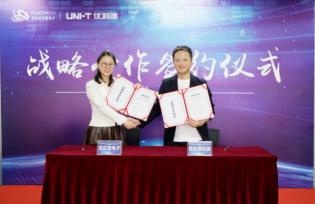 近日,优利德科技(中国)股份有限公司(以下简称“优利德”)与苏州迅芯微电子有限公司(以下简称“迅芯微”)举行战略合作签约仪式。优利德副董事长洪少林先生与迅芯微董事长武锦女士代表双方签署协议。
